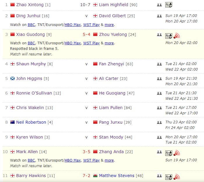 2026年斯诺克世锦赛,是本赛季最后一项赛事,也是最重要的赛事。本次比赛,丁俊晖、赵心童等共有11名中国选手,来到克鲁斯堡出战世锦赛正赛。第一轮首个比赛日,卫冕冠军赵心童、肖国栋、张安达、周跃龙等4名中国选手出战。